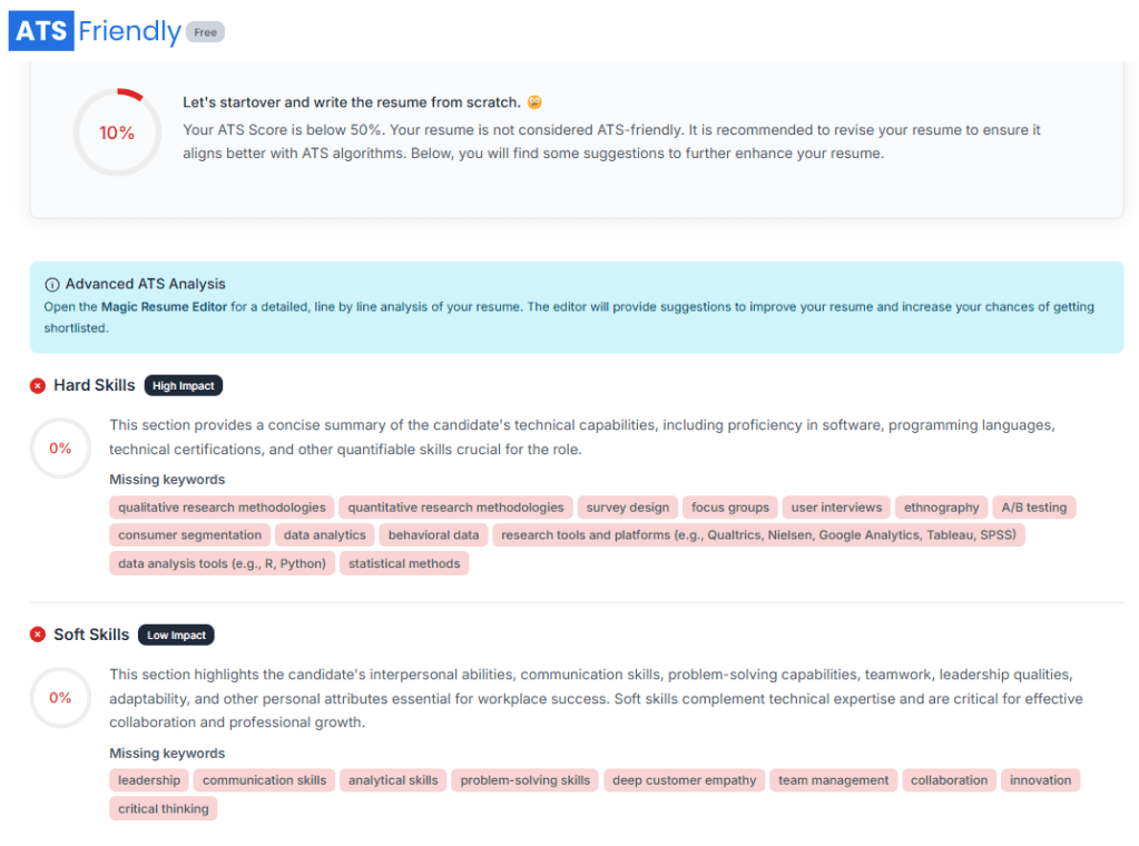 In a job market that mentions the desire for AI experience in every posting, how can the ATS services be so unintelligent as to not understand the equality between “Consumer Research Methods” and “Qual and Quant Research Experience”. When I run my resume and a related job description through these services I tend to score around 10% match. I fail in the most rudimentary comparisons: